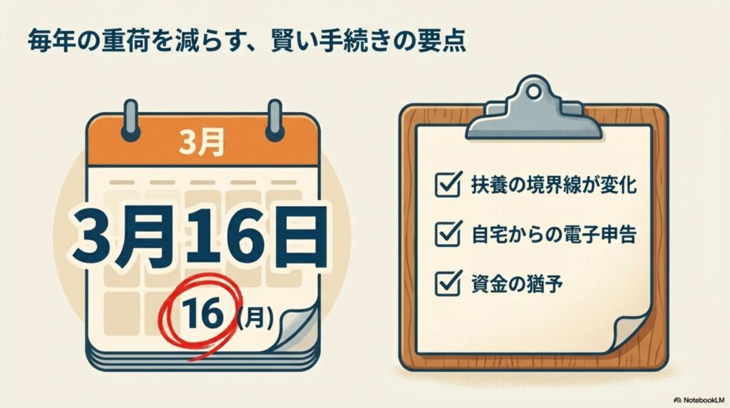 今年の申告期限は、2026年3月16日(月)です。 「まだ時間がある」と思っていると、あっという間に期限が迫ってきます。 誌面の「税理士Q&Aコーナー」でも取り上げられていた、今年の特に重要な変更点と対策を詳しく見ていきましょう。