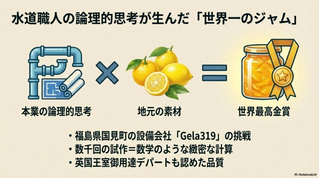 まず驚いたのが、福島県国見町にある水道設備会社さんの挑戦です。 なんと、本業とは全く異なる「マーマレード」作りで、イギリスで開催される世界大会「ダルメイン世界マーマレードアワード」にて、2年連続「最高金賞(ダブルゴールド)」を受賞されたのです。