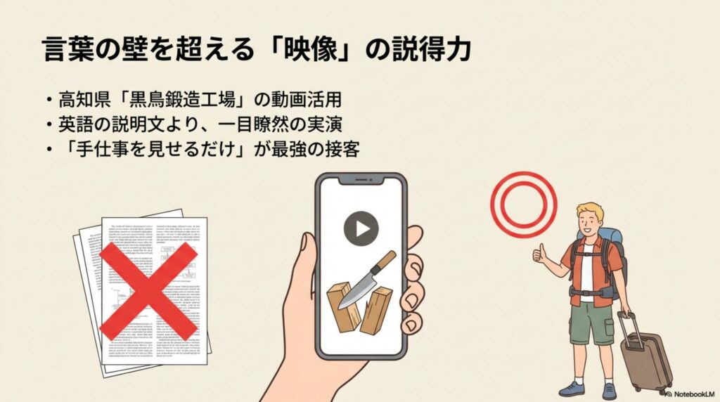 「ITは苦手だし、英語もできない」 そう思い込まず、まずは自分たちの「手仕事」をそのまま動画で見せてみる。 「動画を見せるだけ」というシンプルな接客なら、私たちにも真似できそうですね。
