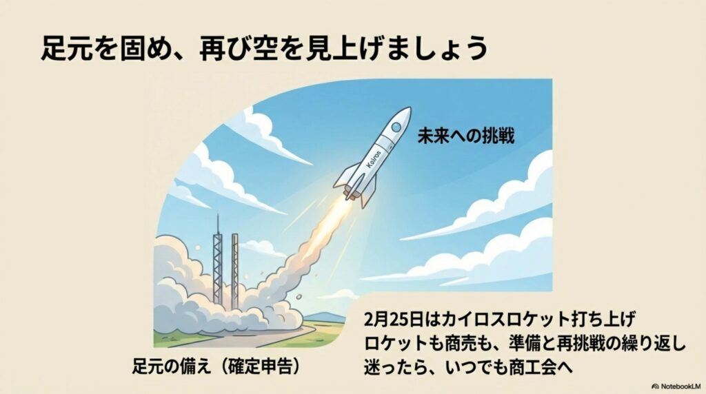 ロケットも、商売も、準備と再挑戦の繰り返しです。 もし、申告の手続きで迷ったり、「うちの商品も何かできないかな?」と思いついたりしたら、いつでも商工会へお越しください。 温かいお茶を淹れてお待ちしています。 まずは目の前の確定申告を、一緒に乗り切りましょう!