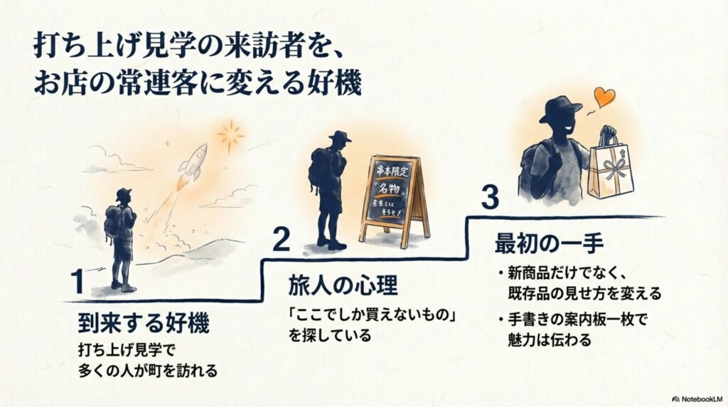 初めてのお客様は、「ここでしか買えないもの」を探しています。これは、町内のすべてのお店にとって、新しい出会いのチャンスです。