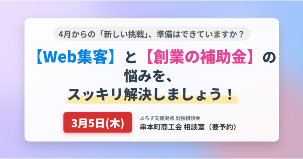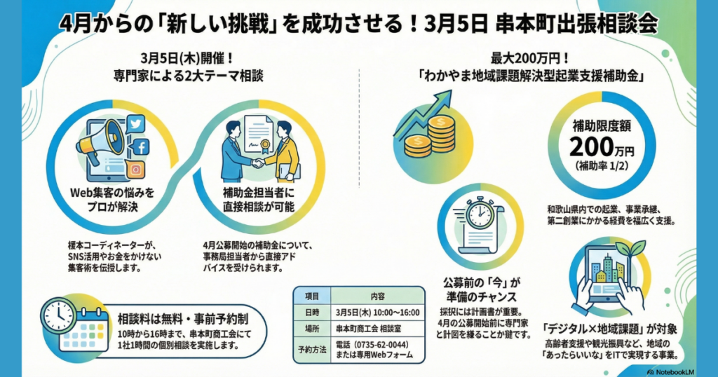実は3月5日(木)、「和歌山県よろず支援拠点」の専門家たちが、予定通り串本のために駆けつけてくれます。 今回は特に、「ネットで売上を伸ばしたい」と考えている方と、「新しい事業を始めたい(創業したい)」という方にとって、またとないチャンスです。