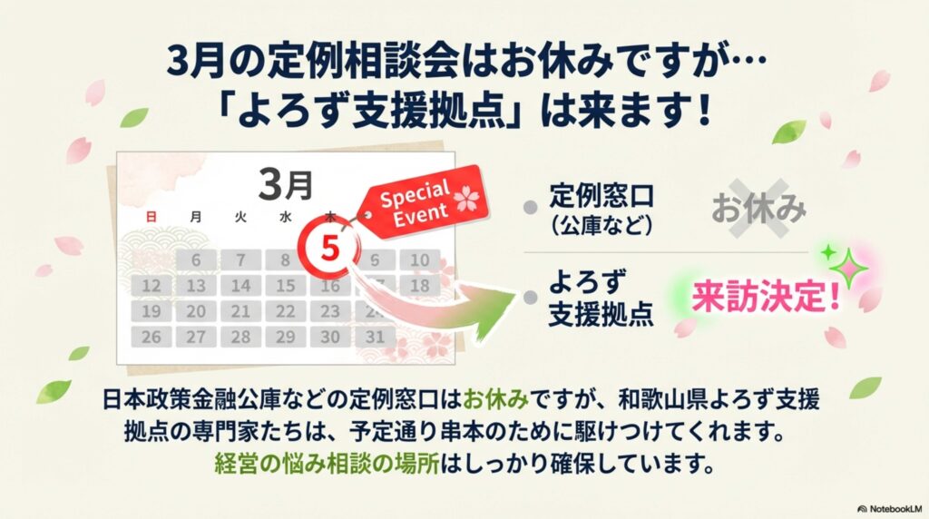 「じゃあ、3月は商工会に行っても誰にも相談できないの?」 いいえ、そんなことはありません。 「和歌山県よろず支援拠点」の相談窓口だけは、予定通り開いています。 他の窓口はお休みですが、よろず支援拠点のコーディネーターさんは、変わらず串本まで来てくれます。 年度末でお忙しい時期かと思いますが、経営の悩み相談の場所はしっかり確保していますよ。