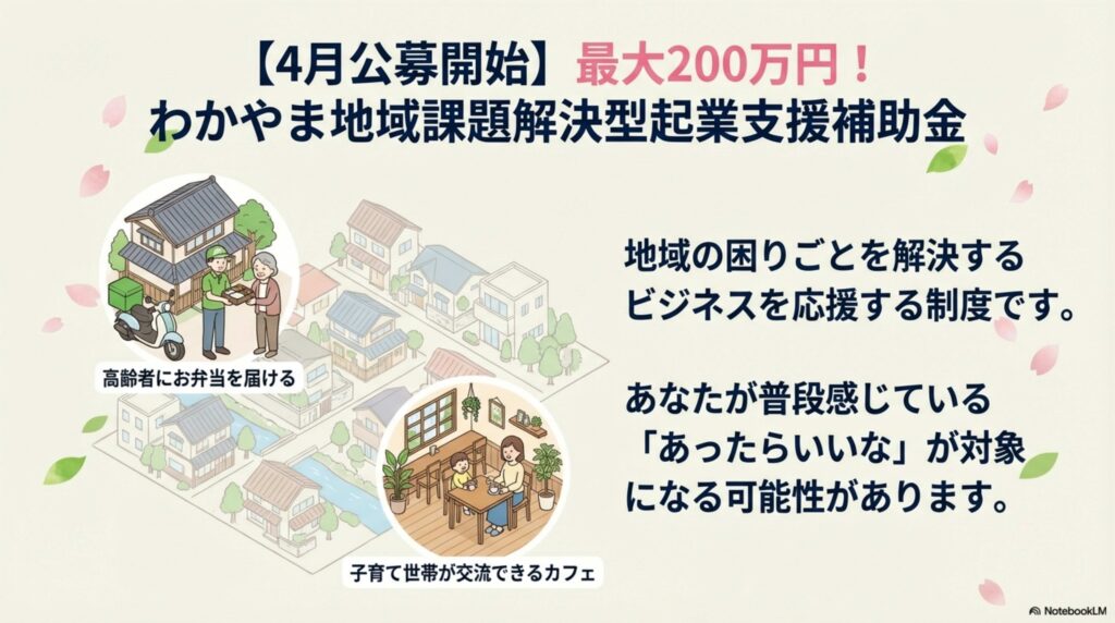 これは、地域の困りごとを解決するようなビジネスを応援する制度です。 「地域課題」というと難しく聞こえるかもしれませんね。 でも、例えば「高齢者にお弁当を届ける」「子育て世帯が交流できるカフェ」など。 皆さんが普段感じている「あったらいいな」が、対象になる可能性があります。