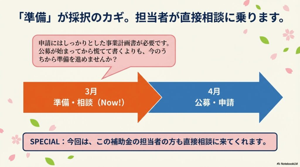 この補助金、実は**「準備」が採択のカギになります。 申請にはしっかりとした事業計画書が必要です。 今回は、なんとこの補助金の担当者の方も直接相談に来てくれます。** 公募が始まってから慌てて書くよりも、今のうちから担当者や専門家と相談して準備を進めませんか? 今回の相談会は、その第一歩にぴったりですよ。