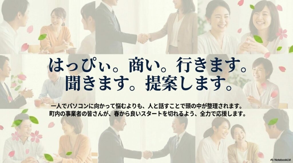 町内の事業者の皆さんが、春から良いスタートを切れるよう、全力で応援します。皆さまのご予約、心よりお待ちしております。