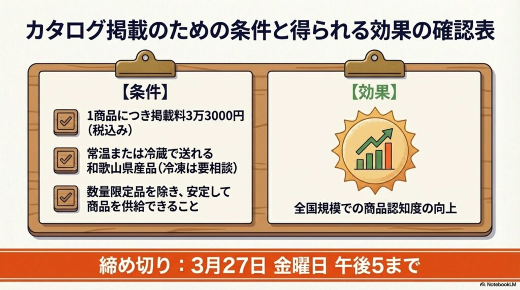 掲載料は1アイテムにつき3万3千円(税込)。対象は常温か冷蔵で送れる「和歌山県産品」で、冷凍品については要相談となります。あらかじめ数量限定とする商品を除き、安定して供給できることが条件です。募集の締め切りは3月27日(金)午後5時となっています。