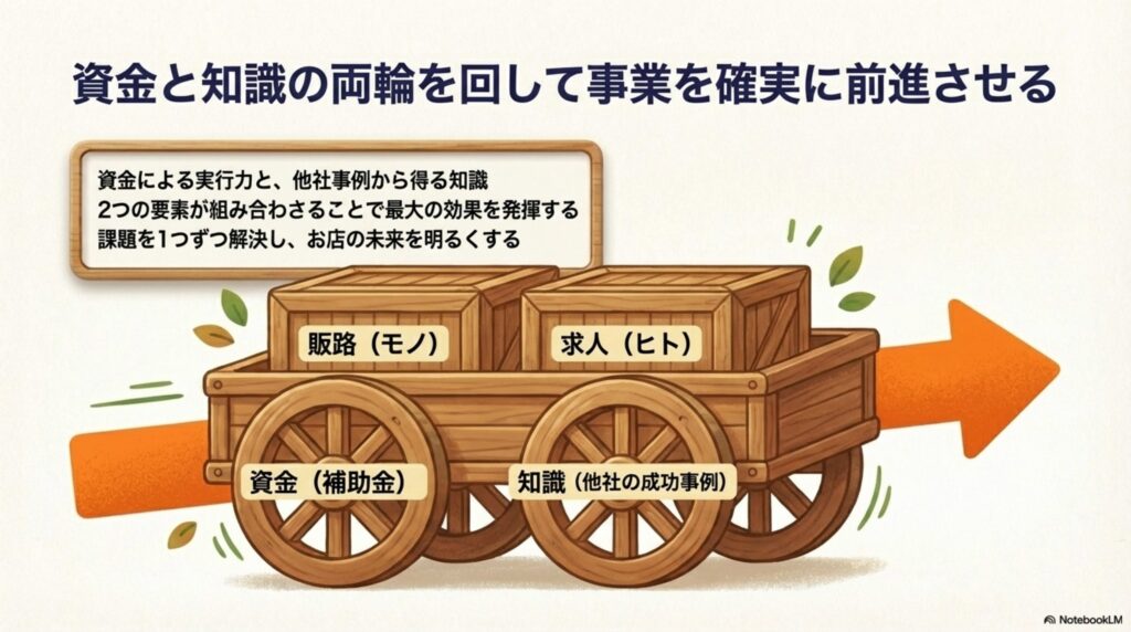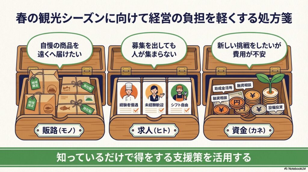 ここまで、販路拡大、人材確保、資金調達、そして学びの機会についてご紹介してきました。重要なポイントを振り返ってみましょう。