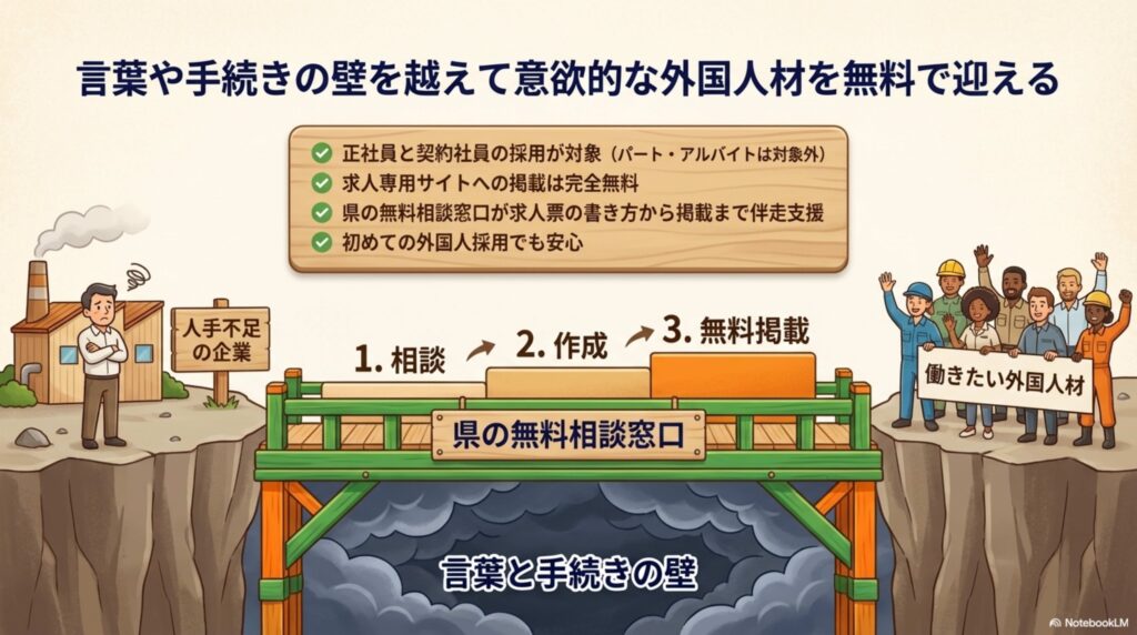 「外国人の採用は初めてで、言葉の壁や手続きなど不安がいっぱい」という方も、どうかご安心ください。県が設置した「WAKAYAMA外国人材雇用サポートデスク」が、求人票の書き方から掲載まで丁寧にサポートしてくれます。