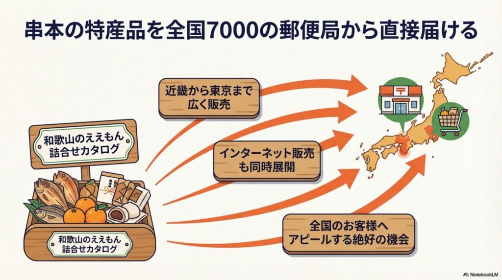 「特選和歌山のええもん詰合せ」というカタログをご存知でしょうか。東京・関東・近畿など、なんと約7,000局もの郵便局で紹介されるうえ、郵便局のネットショップでも販売される予定です。