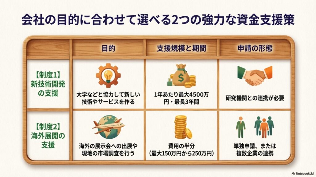 大学などの研究機関と協力して、新しい技術やサービスを開発する事業です。単年度あたり最大4,500万円(通常枠)という非常に規模の大きな支援で、最長3年間にわたってサポートが受けられます。腰を据えた新しい取り組みの、大きな支えになりますね。