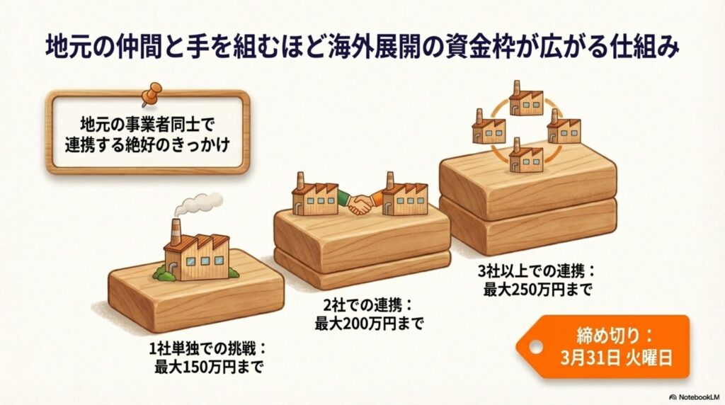 海外の展示会への出展や現地の市場調査にかかる費用を補助してくれる制度です。単独申請なら費用の半分・最大150万円まで、2者のグループなら最大200万円、3者以上なら最大250万円と上限が上がります。地元の事業者同士で連携して挑戦するきっかけにするのもおすすめです。締め切りは3月31日(火)となっています。