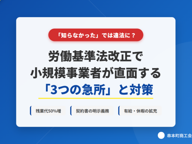 労働基準法や育児介護休業法の改正で小規模事業者の経営はどう変わる?36協定の重要性、契約書の新ルール、有給休暇の年5日義務化など、知らないと違法になる「3つの急所」を徹底解説。串本町商工会での社労士無料相談会や助成金情報も紹介します。