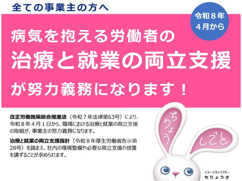 令和8年(2026年)4月1日より、すべての事業所を対象に「治療と仕事の両立支援」が努力義務化されます。大切な従業員ががん等の病気になっても働き続けられるよう、串本町の小さな会社が今日からできる配慮や、無料で頼れる専門機関の相談窓口について商工会が分かりやすく解説します。