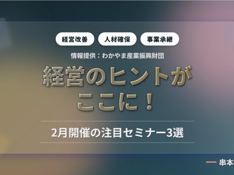 2月に開催される「経営改善」「人的資本経営」「事業承継」の注目セミナー3選をご紹介!わかやま産業振興財団から届いた、串本町の事業者様にも役立つ最新支援情報や、無料の海外展開サポートについても解説します。経営課題解決のヒントがここに。
