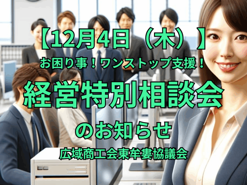 東牟婁地域の事業者様へ。12月4日(木)に無料の「経営特別相談会」を開催します。資金繰り、事業承継、人材問題など、経営のお悩みを各分野の専門家にワンストップで相談できる絶好の機会です。一人で悩まず、お気軽にご参加ください。