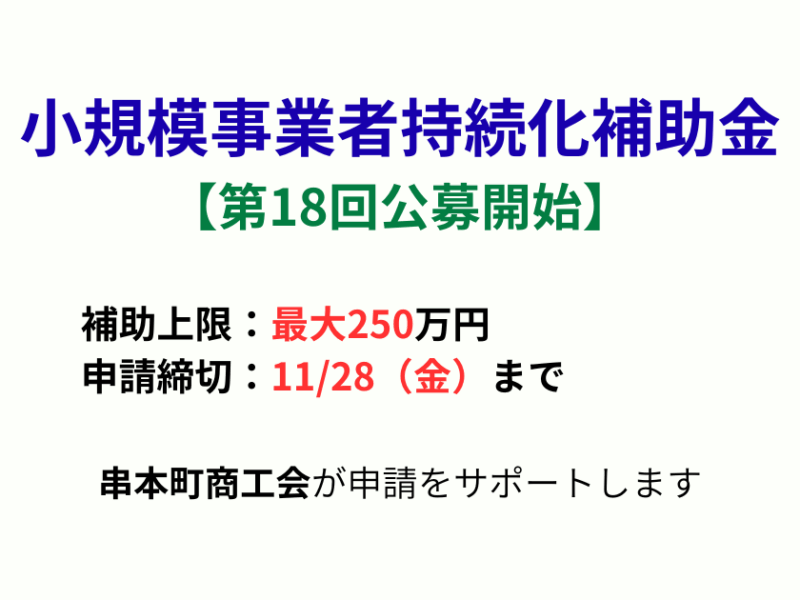 【串本町の事業者様へ】「小規模事業者持続化補助金」第18回公募が開始!補助額や対象経費、電子申請の方法、11月28日の締切までのスケジュールを商工会が分かりやすく解説します。申請のご相談はお早めに。