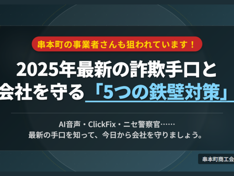 「ウイルスの警告音が鳴った」「警察を名乗るビデオ通話が来た」それ、詐欺かもしれません。串本町商工会が、2025年最新の詐欺手口(AI音声、ClickFixなど)と、会社を守る「5つの対策」を徹底解説します。